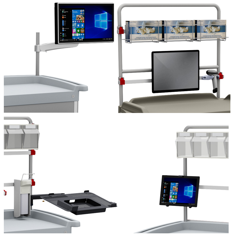 These trolleys can be equipped with different types of devices (laptops, tablets, all-in-one PCs, etc) and barcode readers, while drawers can be mixed to accommodate all types of medications.
